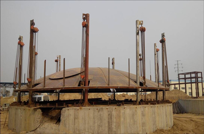 在焊接油罐的第一步就是需要對油罐的整體重量有正確的計算,一般選定電動葫蘆的總額定重量為油罐整體重量的1.3-1.5倍以上。確定焊灌電動葫蘆臺數后,要精確計算和確定吊點的間距,個各吊點間距一定要相等且均衡布點。由于施工工藝上要求少開天窗,因此首先吊點要盡可能少,除要求首次吊點的間距一致外,還要考慮以后吊點的均衡設置,以保持各吊點的間距相等,盡可能為電動葫蘆的均載運行創造條件。根據以往的施工經驗,首次吊點一般為選定電動葫蘆總臺數的一半,第二次吊裝施工完畢后,即在吊裝第三層前要及時補進其余所有吊點立柱,掛上整套焊灌電動葫蘆,全部投入第三層的吊裝運行。